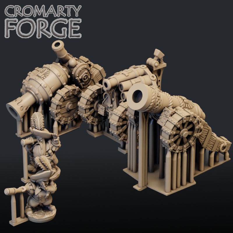The 10mm City Dwarf Artillery set contains files to print cannons, flamers, and repeater cannons along with 8 city dwarf crew.