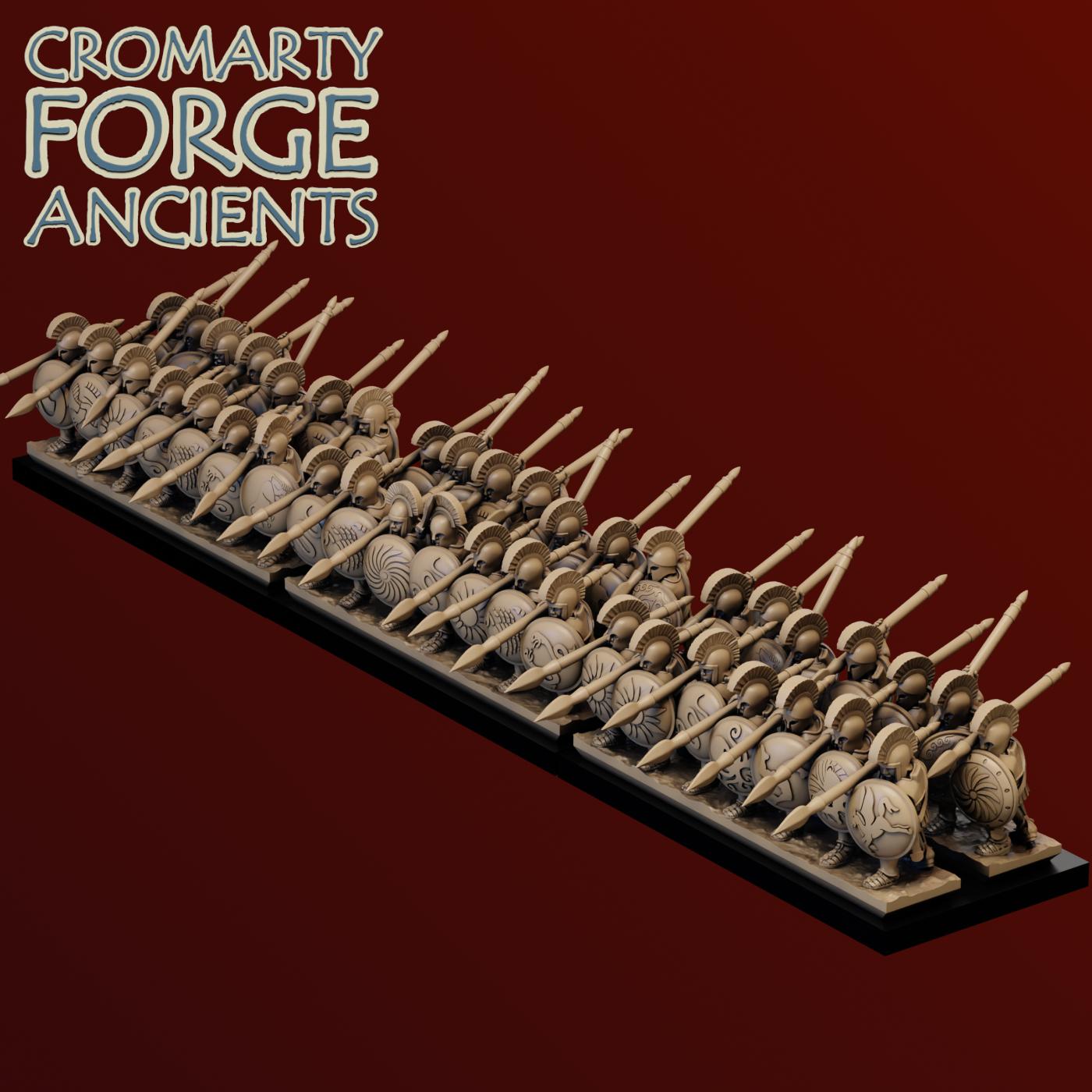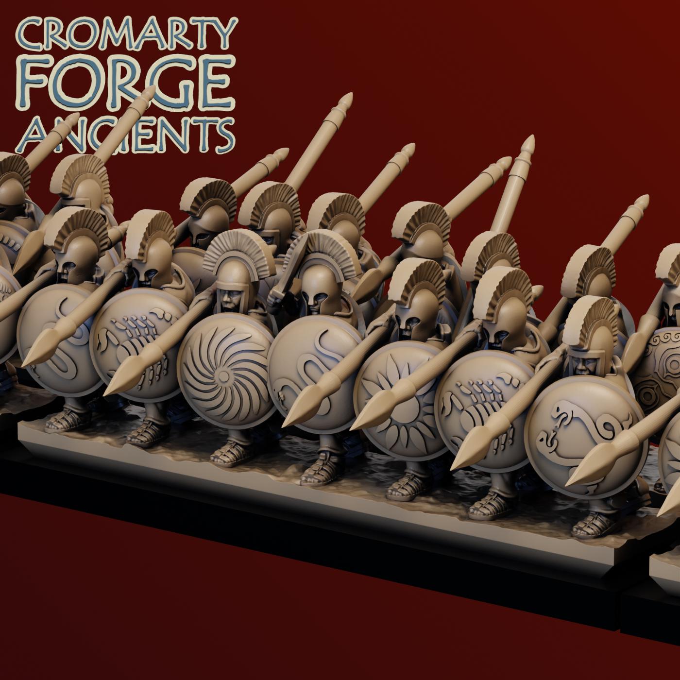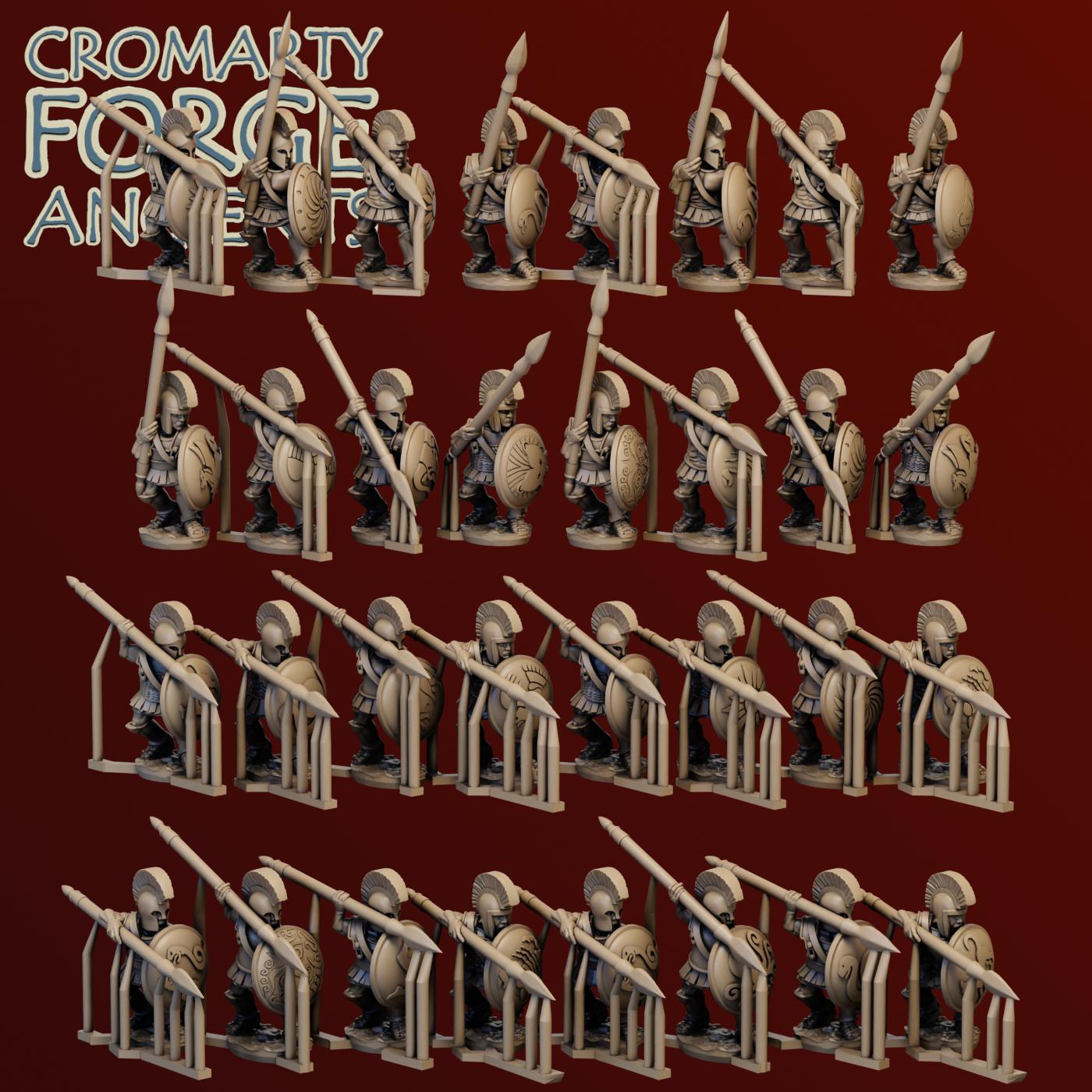 10mm Earlier Greek – Hoplites. Attacking set contains files to print a huge variety of hoplites (with body armour). Each sculpt is presented with various shield options (including a Lambda shield to represent spartans), different helmets (including the iconic Corinthian and Illyrian) and both with and without cloaks. Sculpts are available in strips and mounted separately.