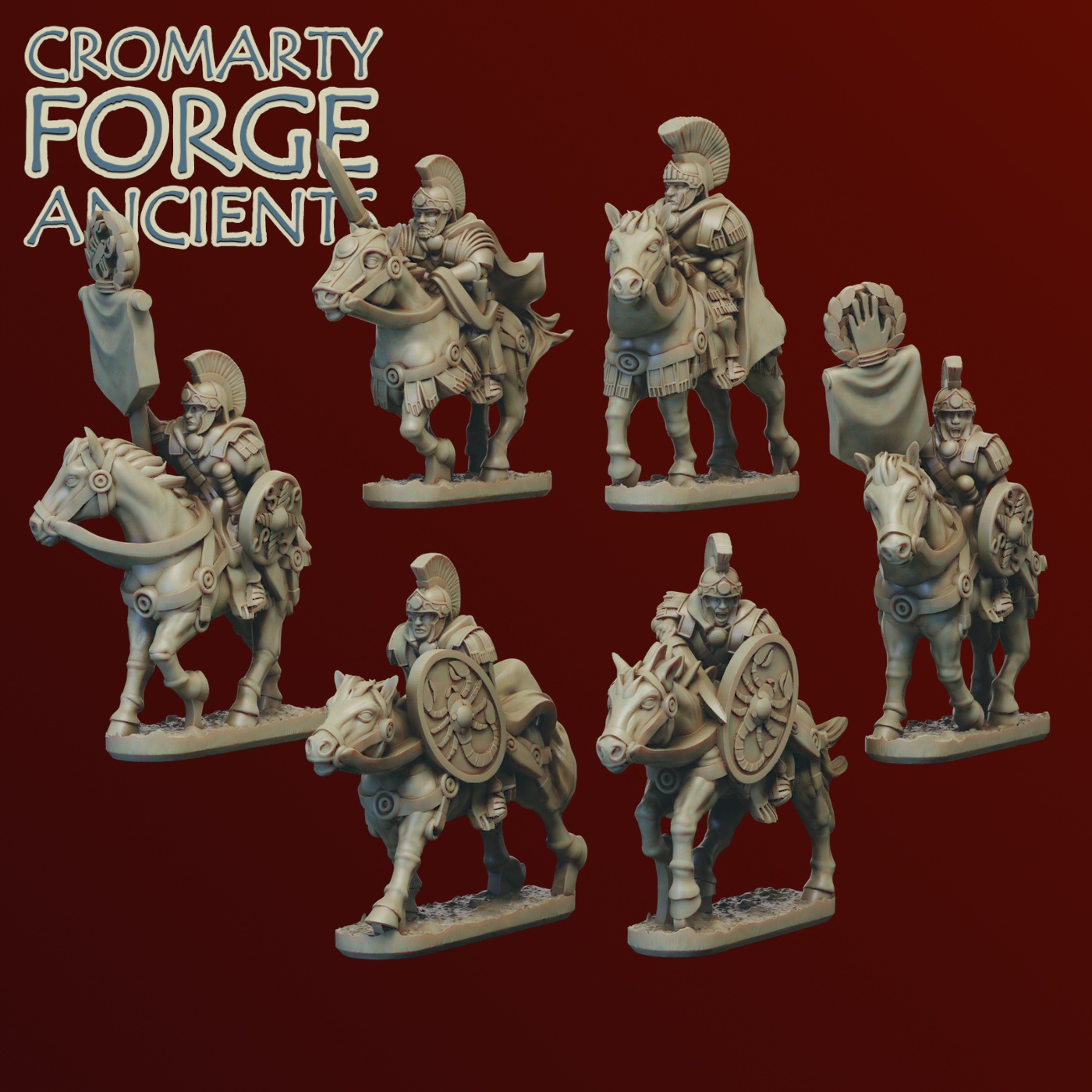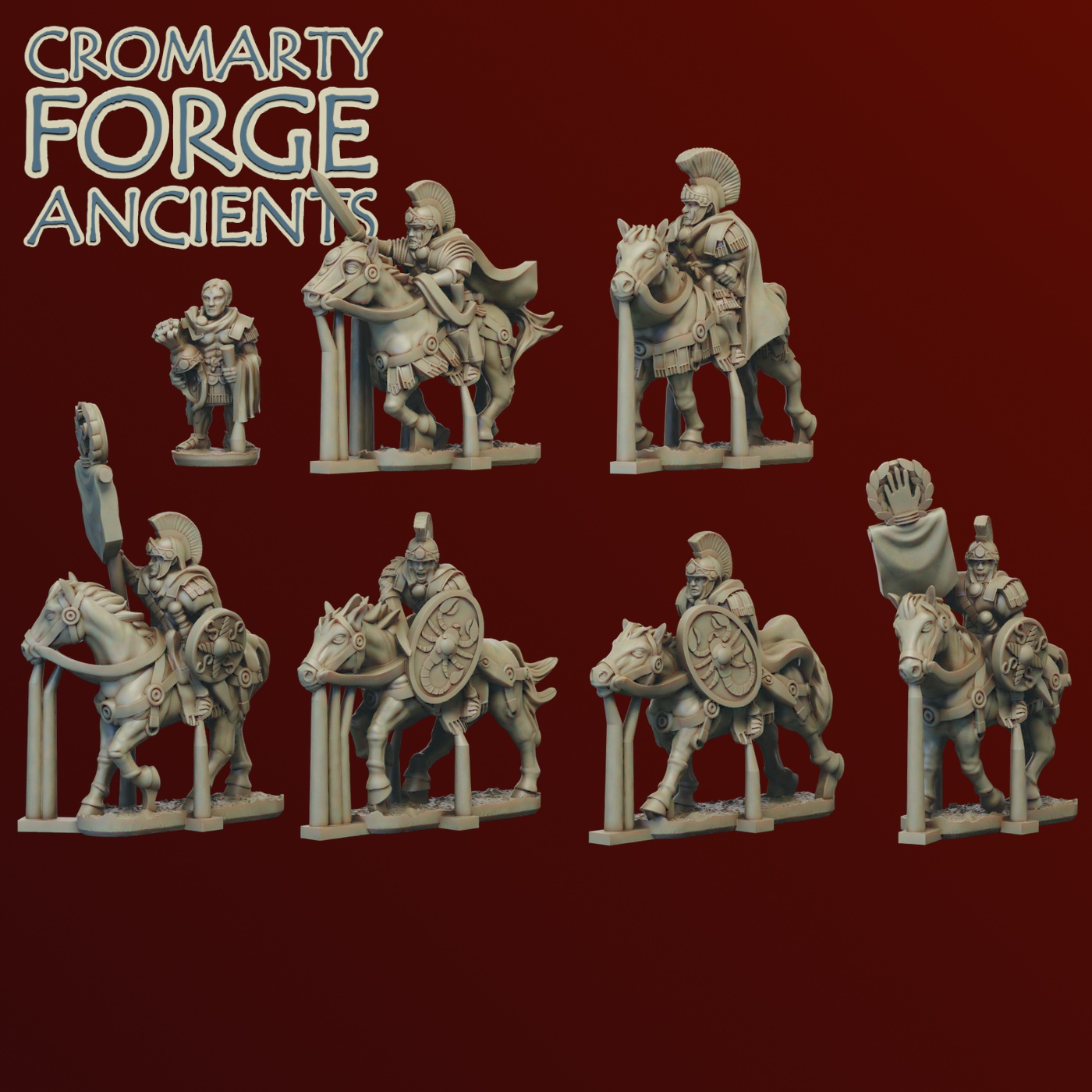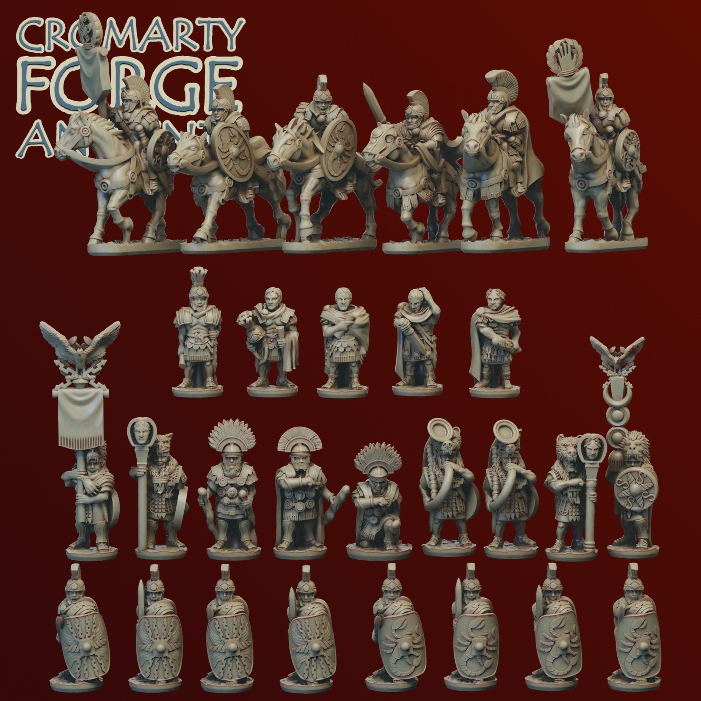 The Imperial Romans Command pack consists of 28 individual miniatures: 3 Generals (Vespasian, Agricola and Publius Quinctilius Varus), 4 Legates (two mounted, two on foot), Three centurions, Two cornicens (Musicians), Two mounted praetorian Signifers (Standard bearers), two mounted Praetorian guards, Two eagle standards, Two Imaginifer (Carrying standards with he likeness of the emperor) and eight guards.