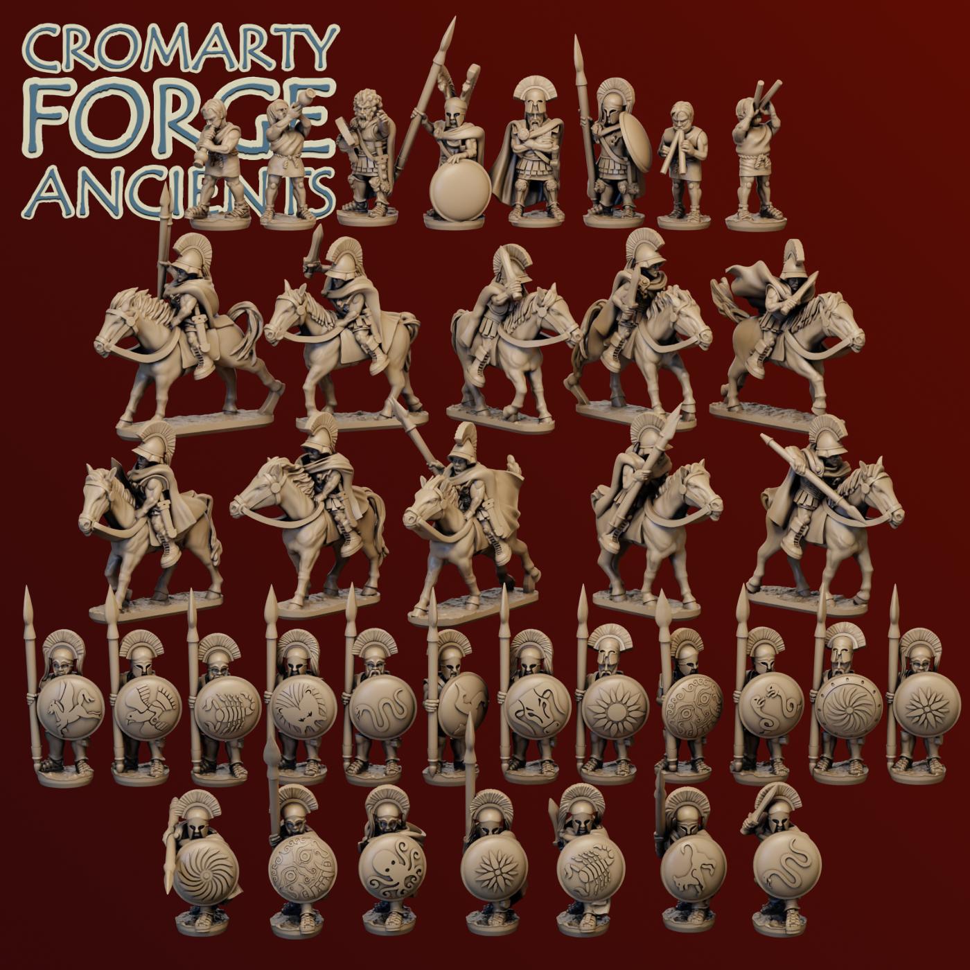 10mm Earlier Greek Command: set contains files to print a large variety of greek commanders, including over 12 poses of hoplite commanders, 10 poses of cavalry command, 4 musicians and 3 generals. With the exception of the musicians and generals all models come with at least 2 helmet variations, 2 shield variations and multiple options on cloaks, body armour and shields.
