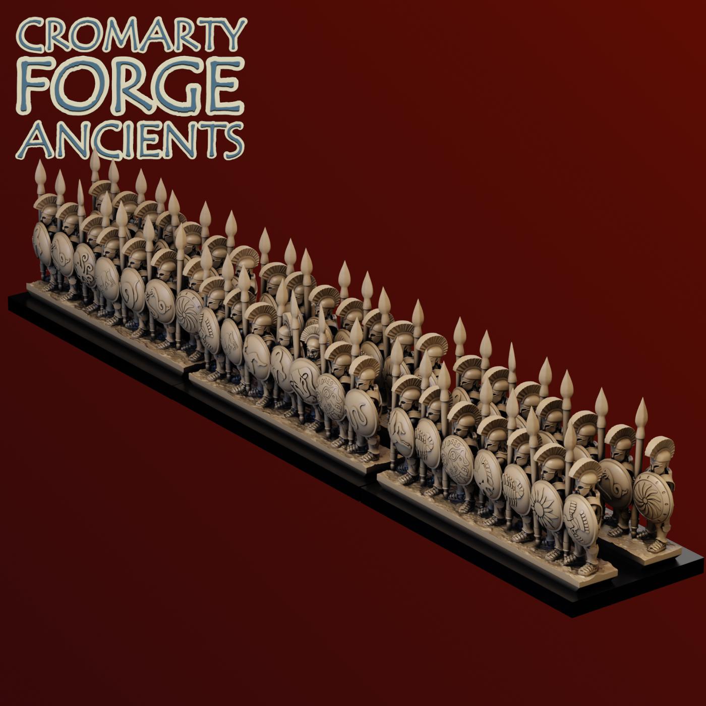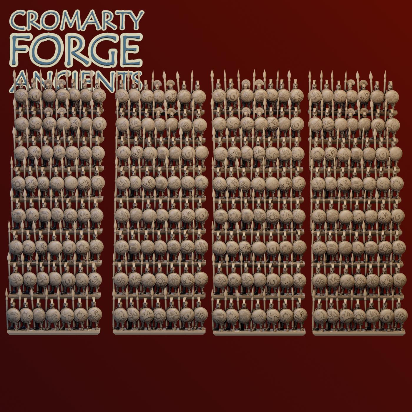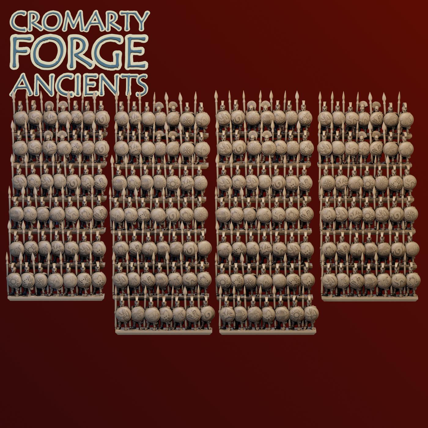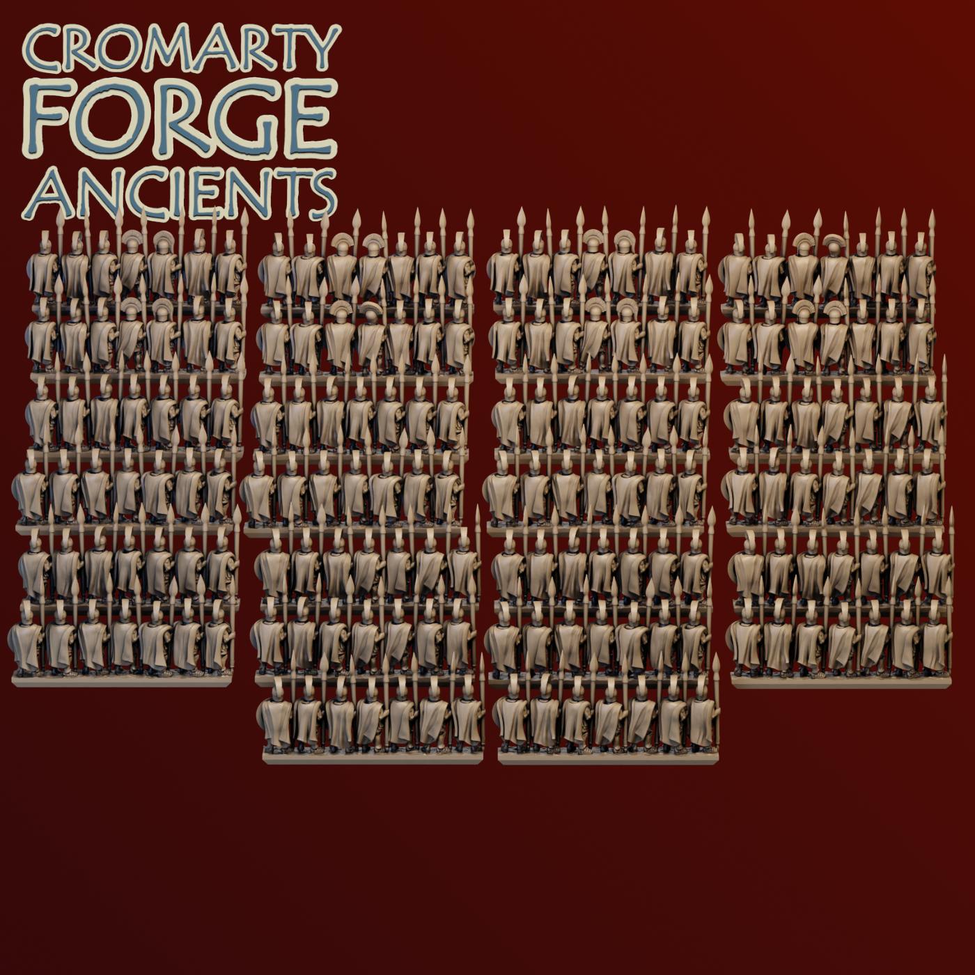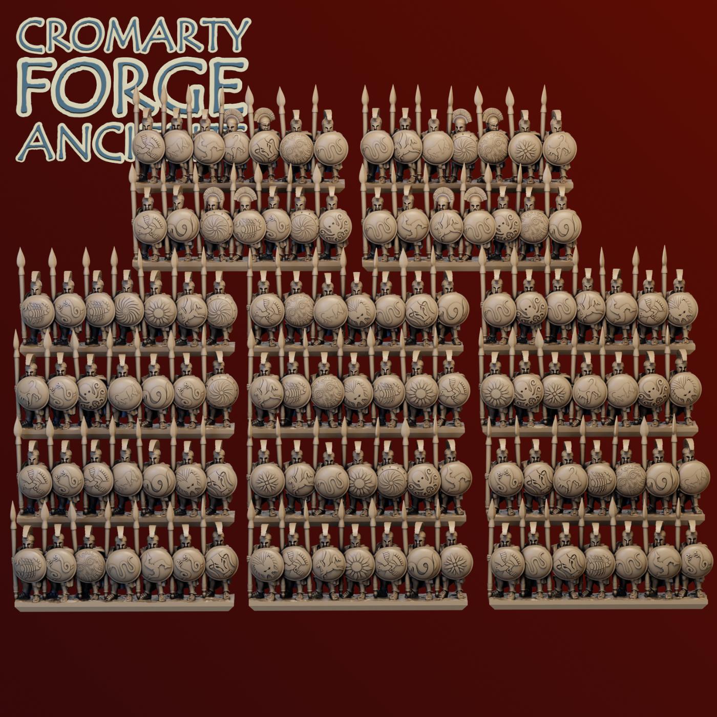 10mm Later Greek – Hoplites set contains files to print a huge variety of hoplites (with body armour). Each sculpt is presented with various shield options (including a Lambda shield to represent spartans), different helmets (including two variations of open eared corinthian helmets) and both with and without cloaks. Sculpts are available in strips and mounted separately.