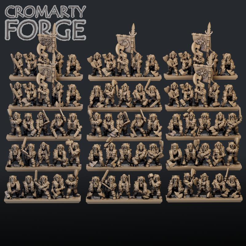 10mm Norse Berserkers set contains files to print norse berserkers in strip and separated format. There are 10 strip sculpts and a banner strip with 5 alternate icons, and over 45 individual berserkers. The berserkers are led by Odr, the god of divine madness.