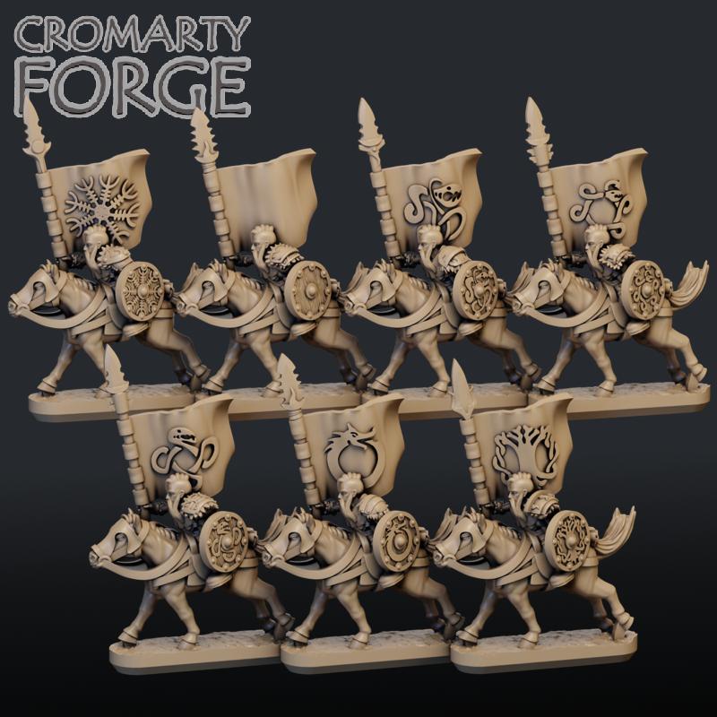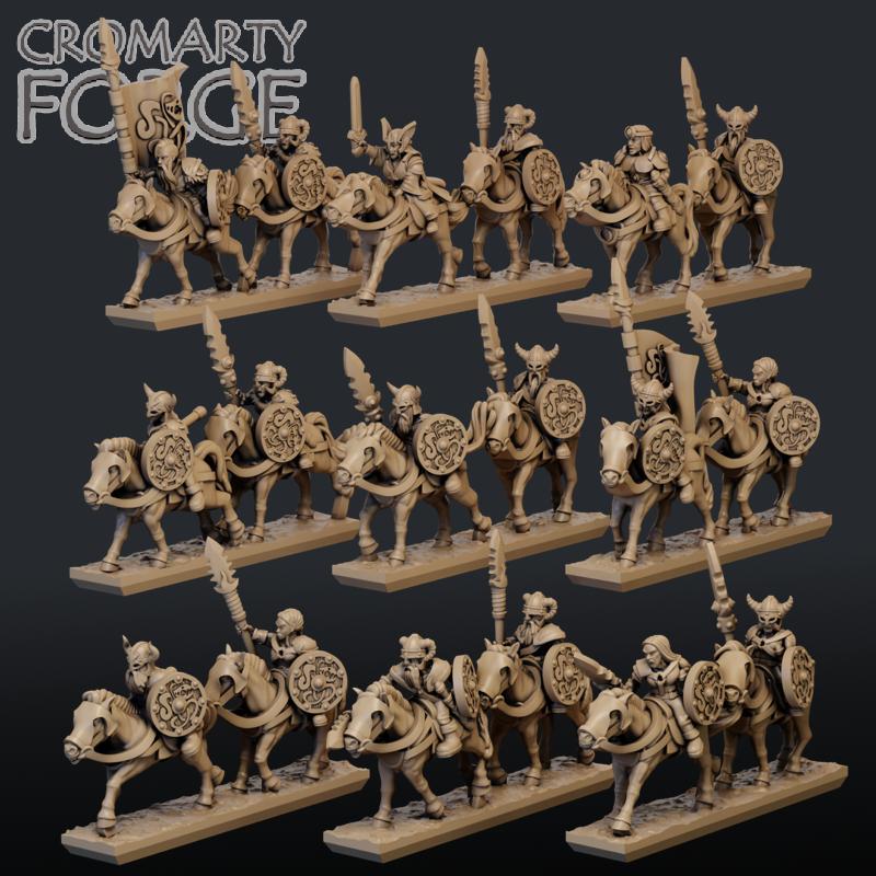 10mm Norse Cavalry set contains files to print Norse cavalry units. There are five alternate cavalry strips (strips of 2 horses) 2 alternate banner strips and 2 alternate commander strips – featuring Balder – the god purity and Gna – The messenger of Frigg. Each sculpt is also supplied with 6 different shield designs and a blank shield option. Oh, and there are also files for each sculpt to be printed separately rather than in a strip format.