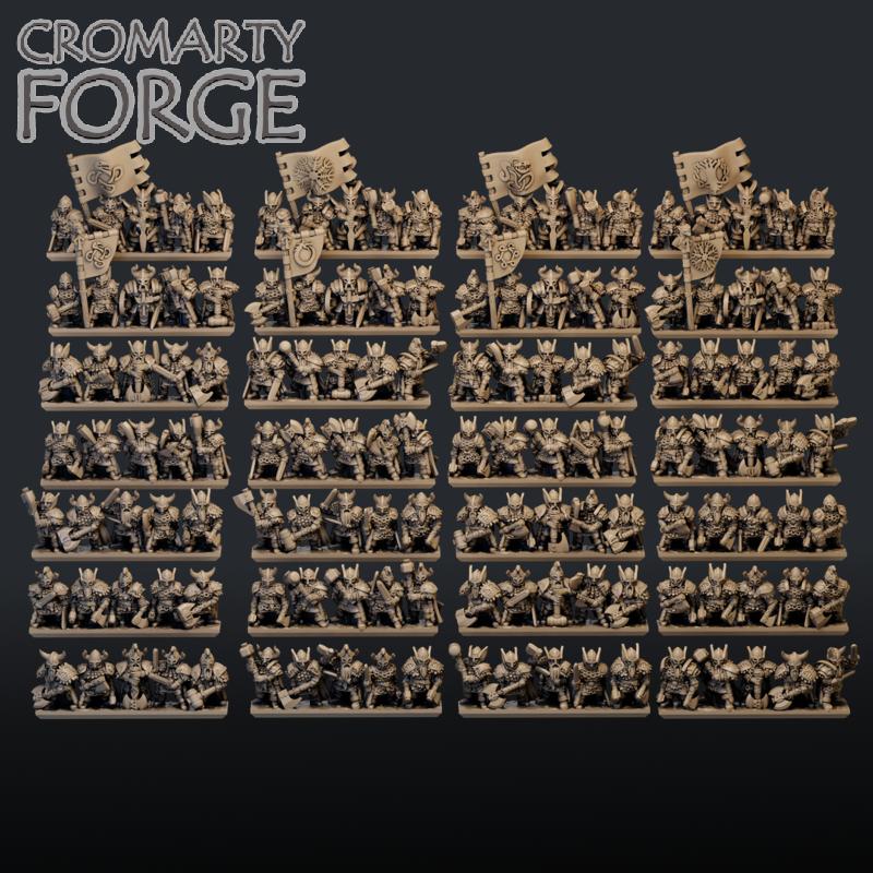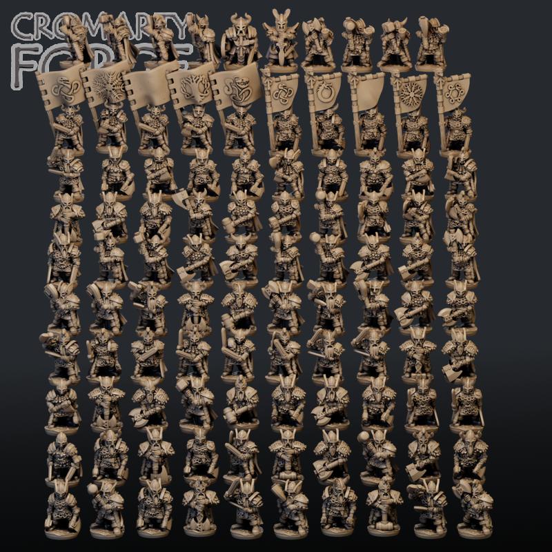 10mm Norse Huscarls set contains files to print 20 strips of Norse Huscarls – and 2 banner strips – led by either Tyr, the god of War, or Heimdal the watchman. Each of the banner strips is presented with 4 alternate designs. Files to print each of the sculpts separately are also included in this set.