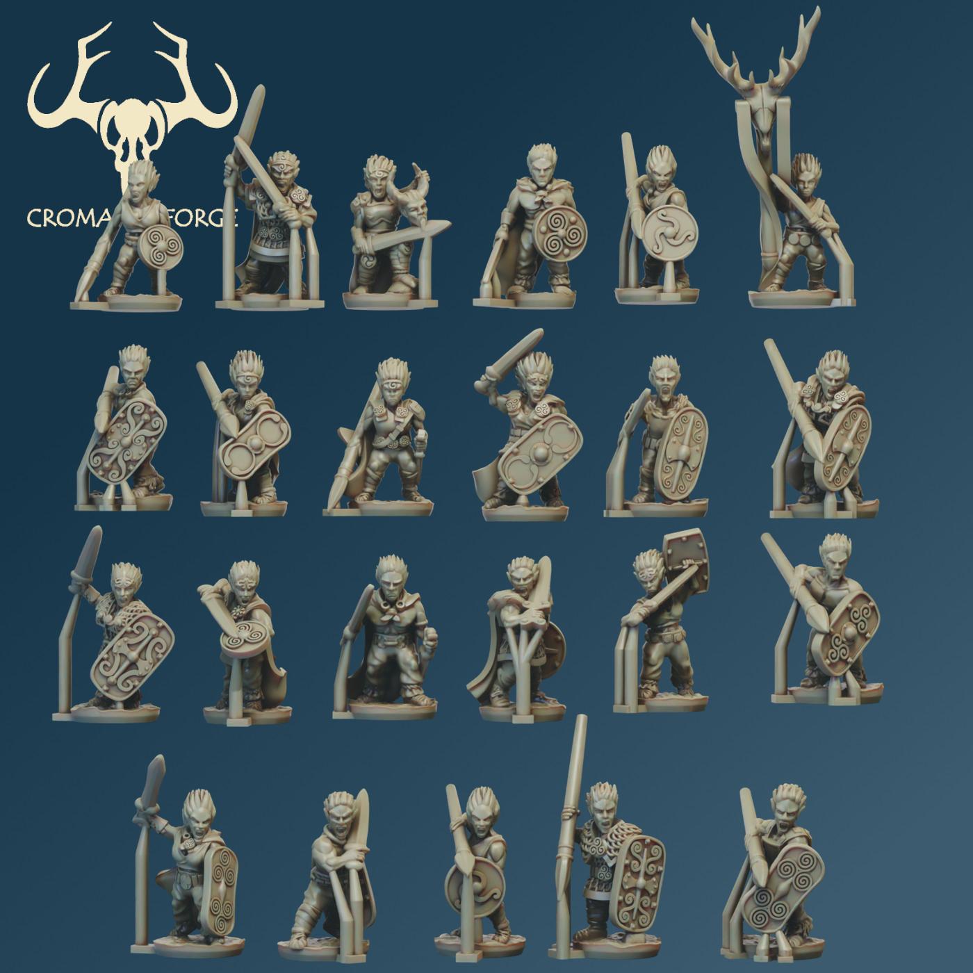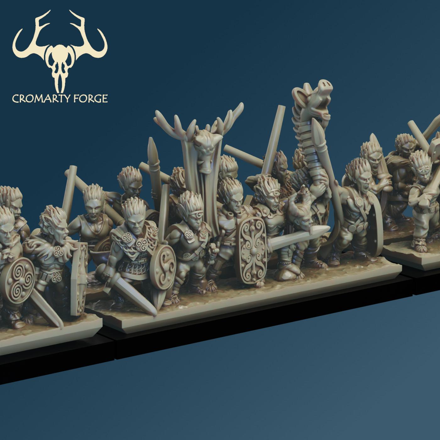 The Tribes of Prydain warrior set is a selection of STL files for printing on a resin printer. The set contains stl files for 5 warrior strips, and 3 banner strips. In addition to the strip mounted models, the files are also provided for 37 warriors separately mounted (including 3 heroes, 3 standards and 3 Carnyx players).