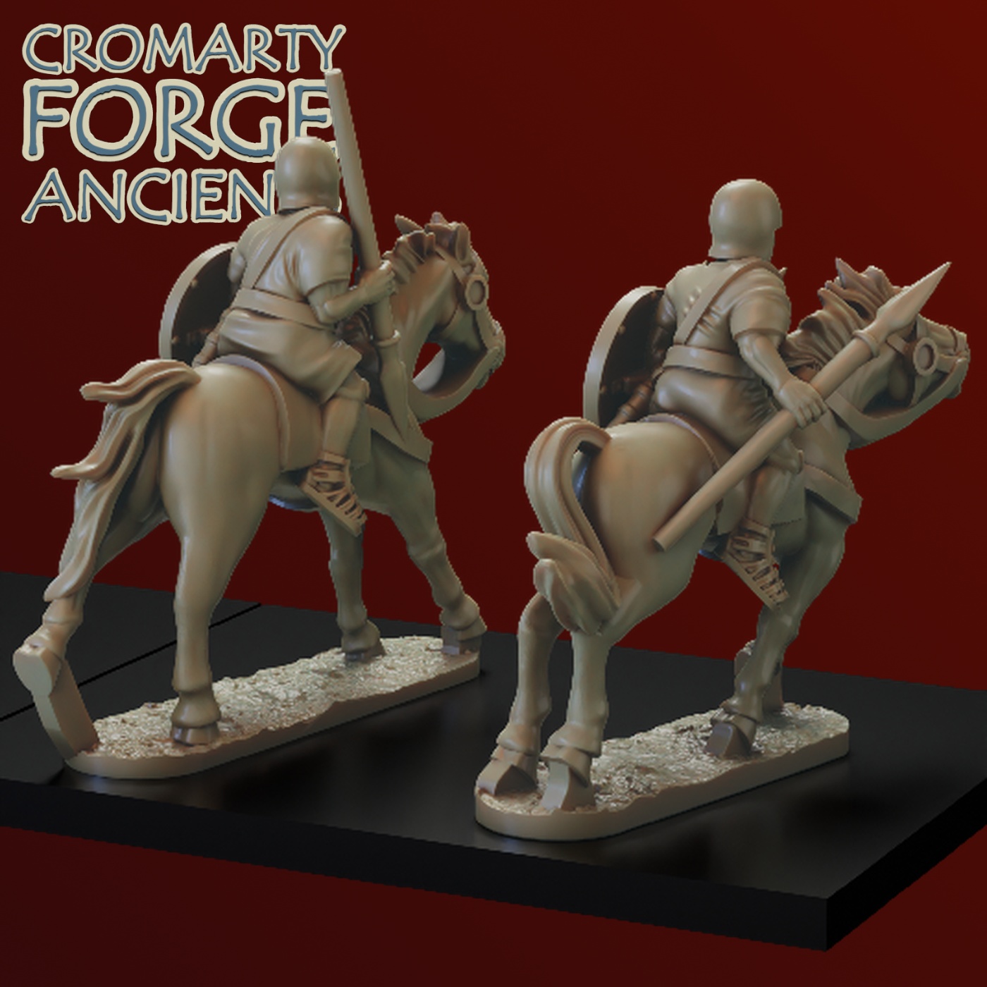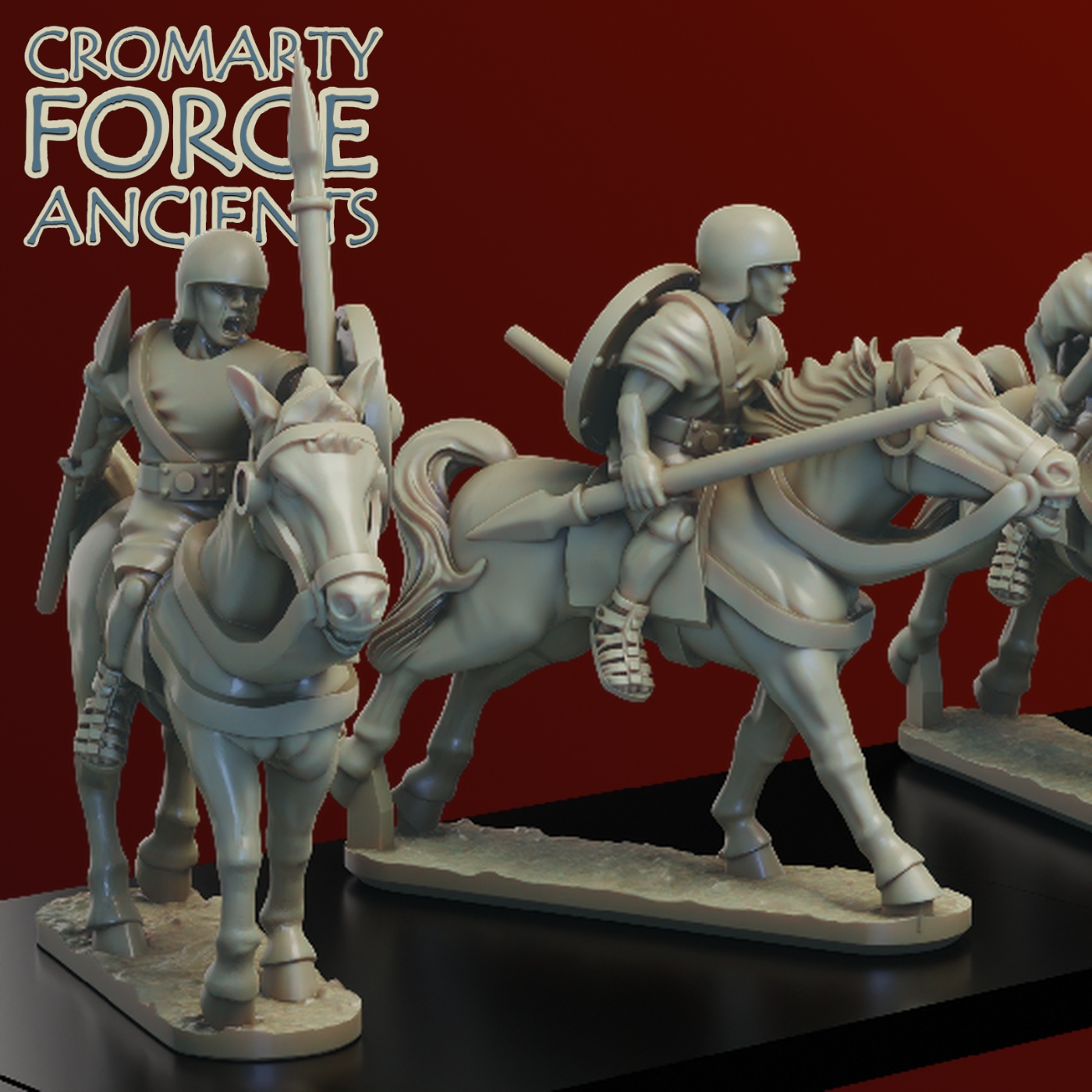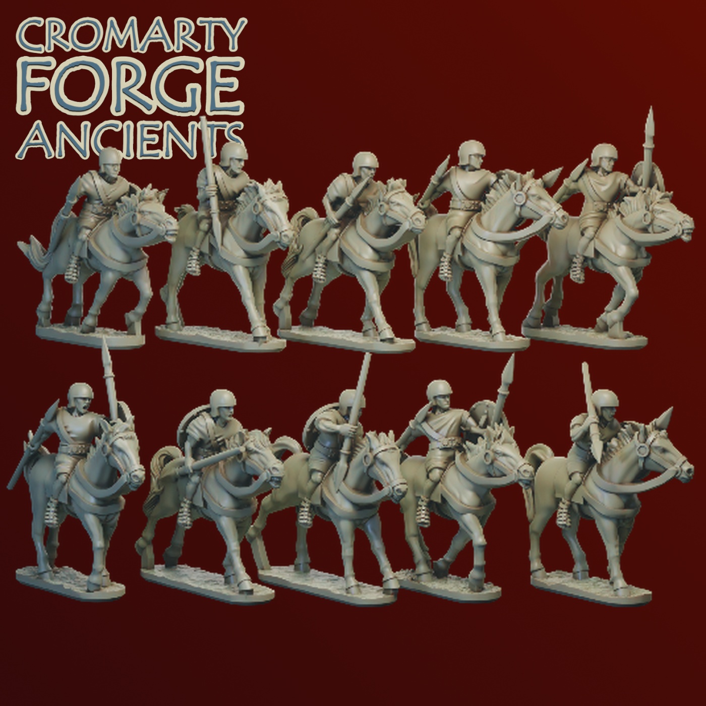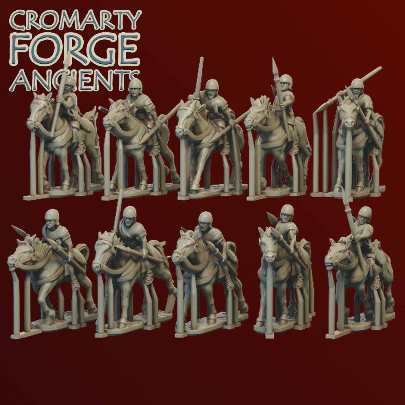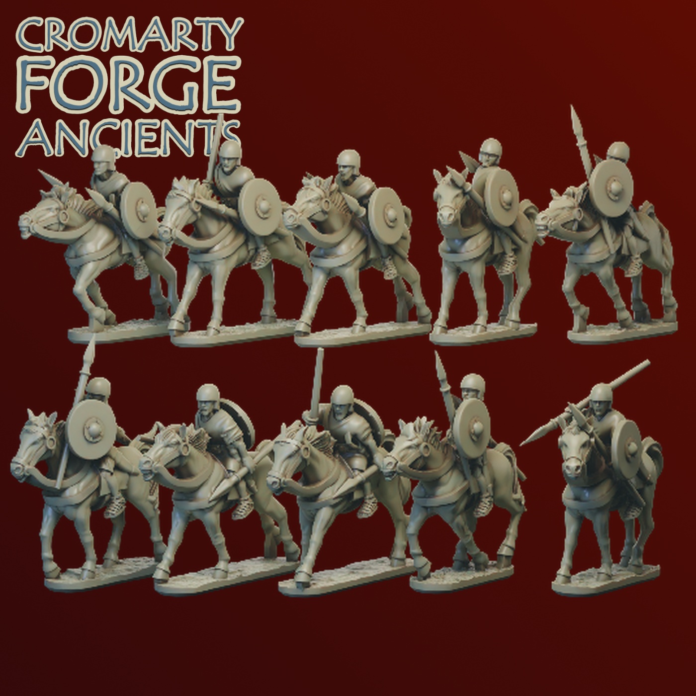 The Ancient Era allies set consists of 10 spanish light cavalry armed with light spear. Supplied with separate round shields that can be optional mounted on the riders arms.
