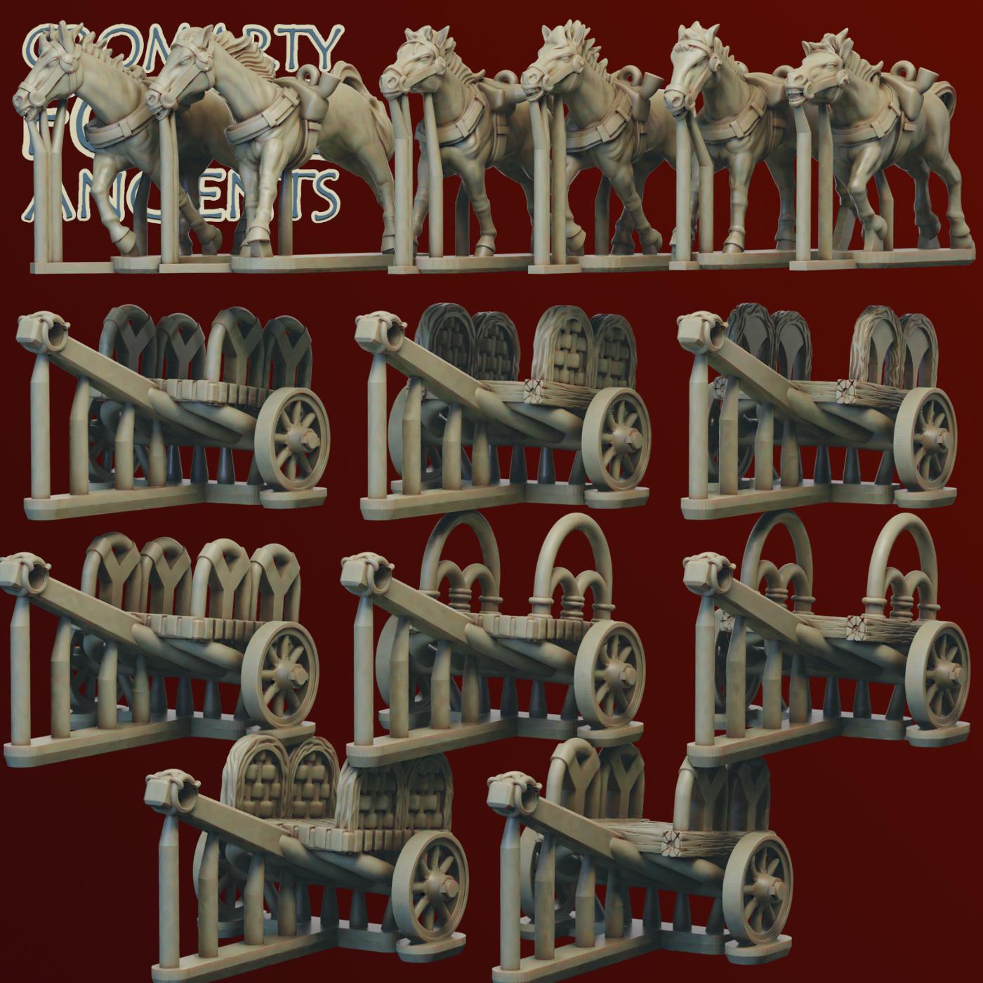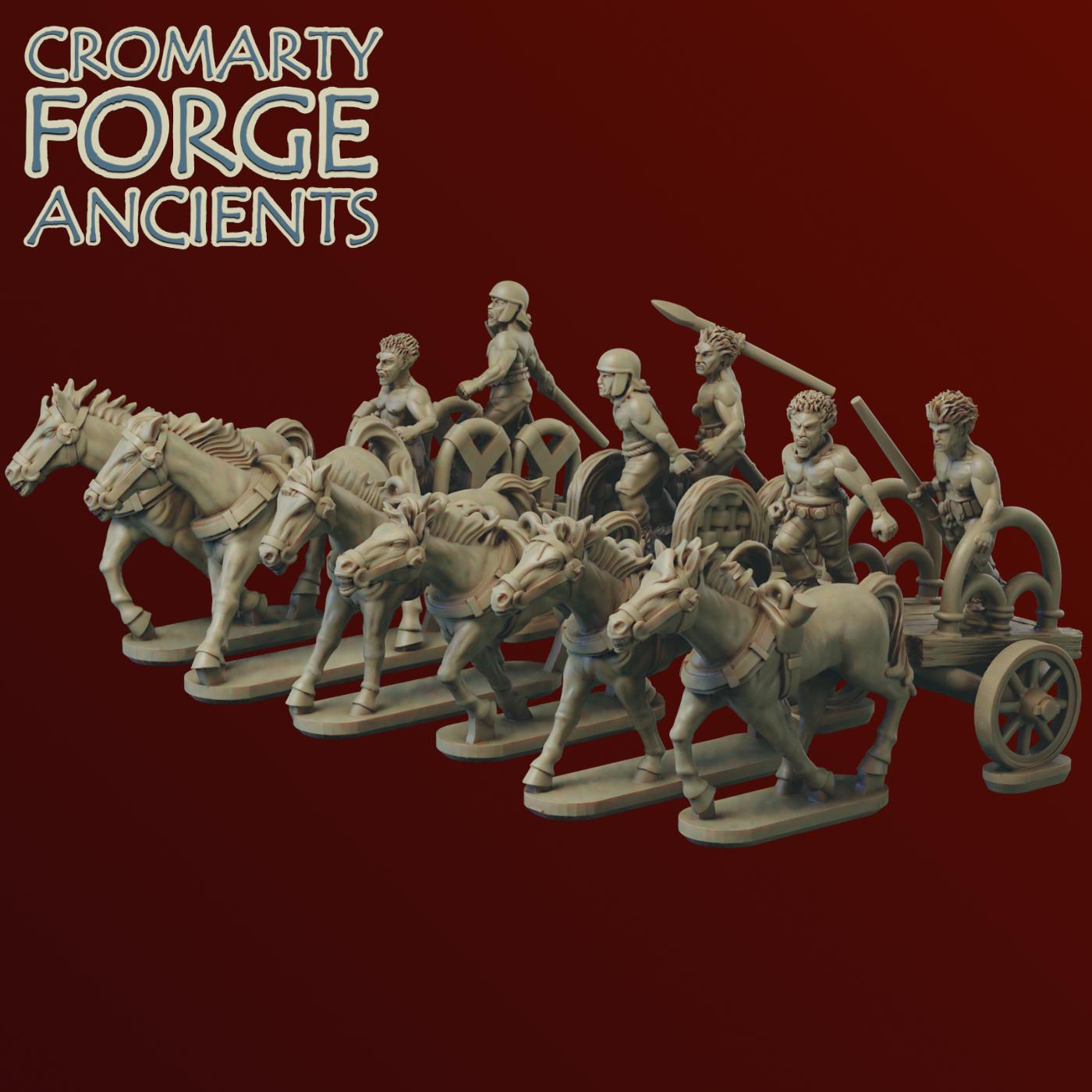 The Briton Chariot set consists of stl files for 3 chariot crew, 3 chariot drivers, 6 horses and 8 chariots, as well as over 50 shield designs.