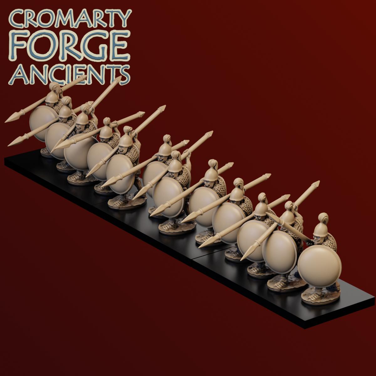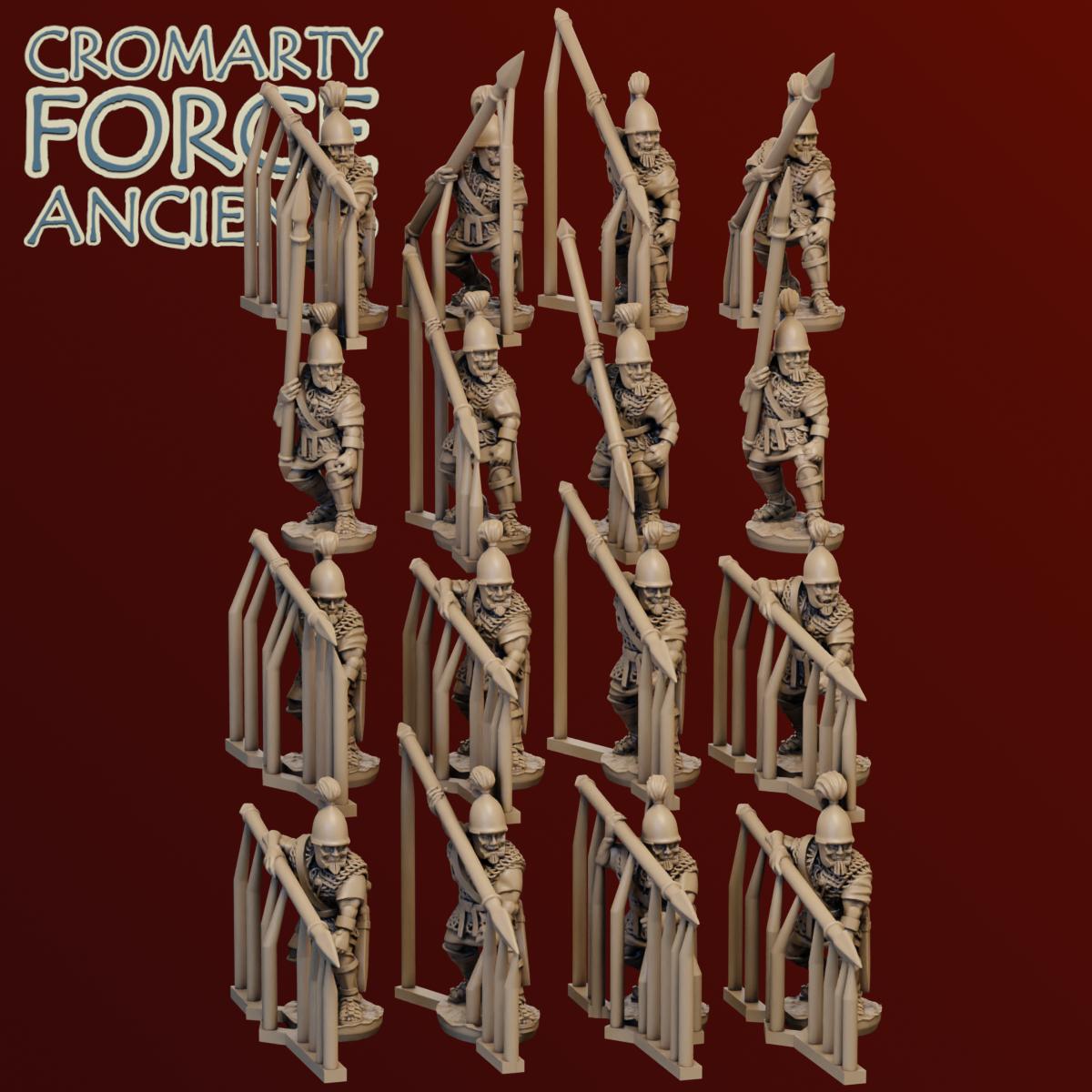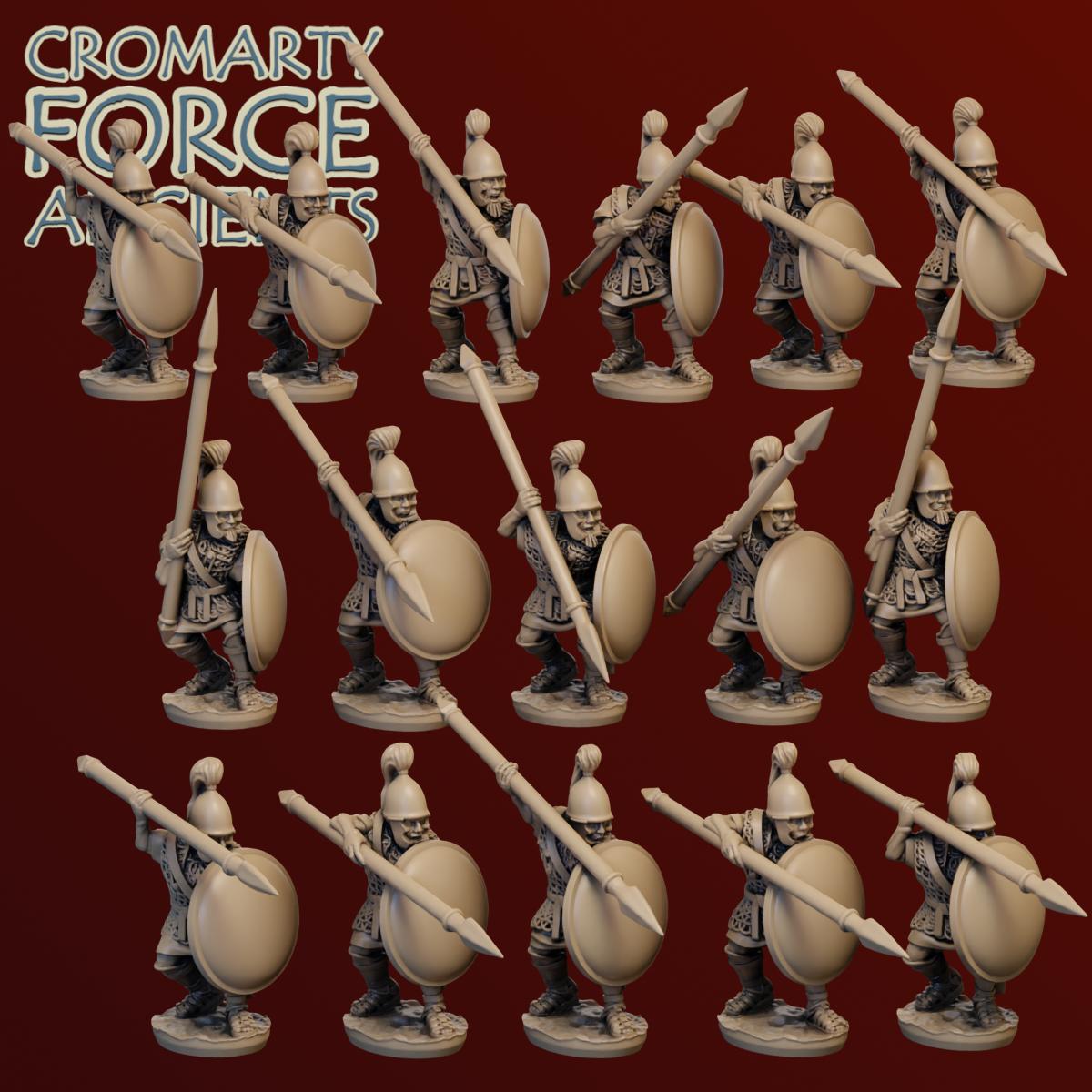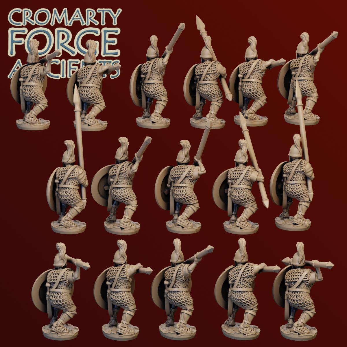 15mm Carthage Infantry Attacking set consists of 16 Carthaginians in chain mail armed with long spears and Aspis. Each sculpt comes with 3 alternate helmets (meaning 48 sculpts are included). The Aspis are to be printed separately (files included).