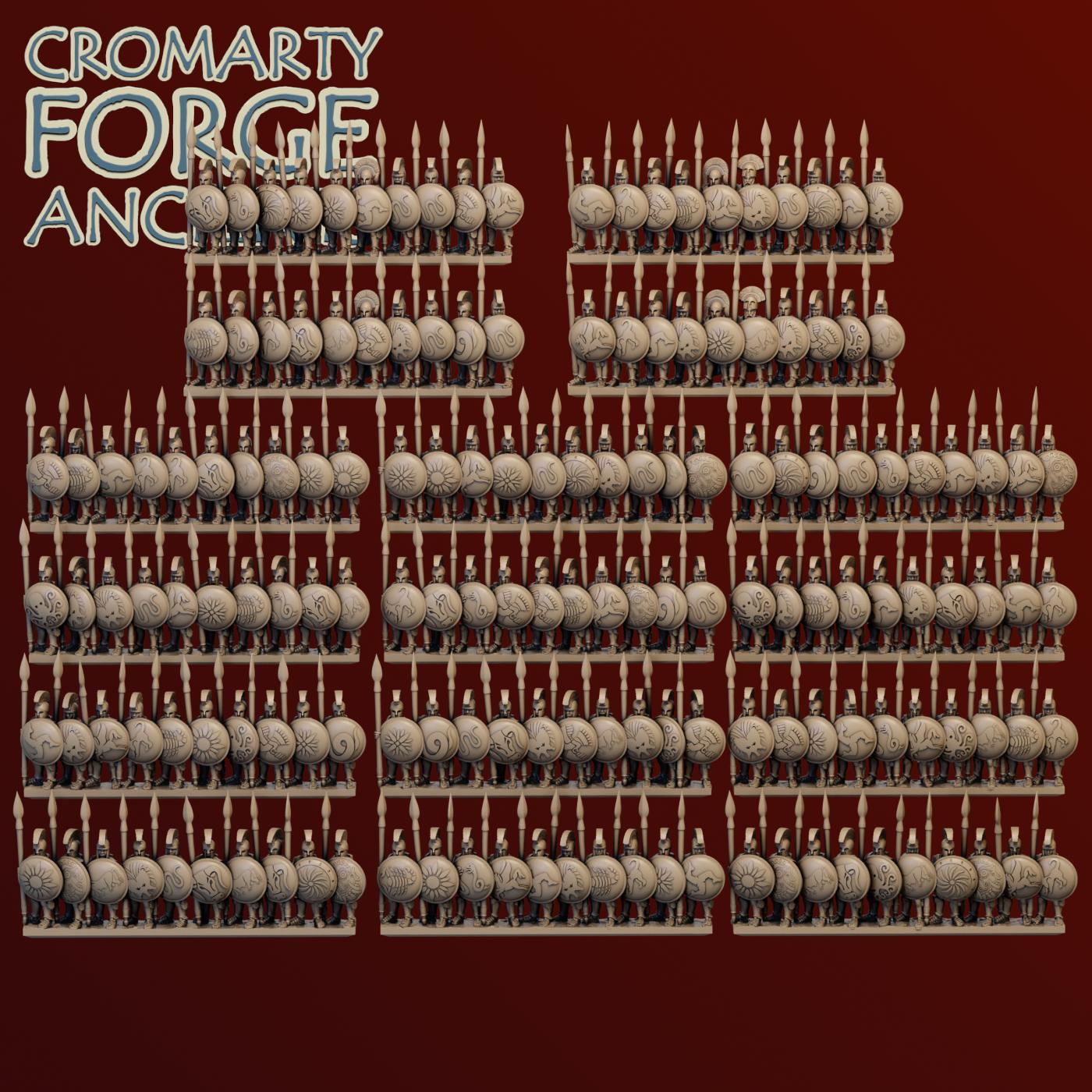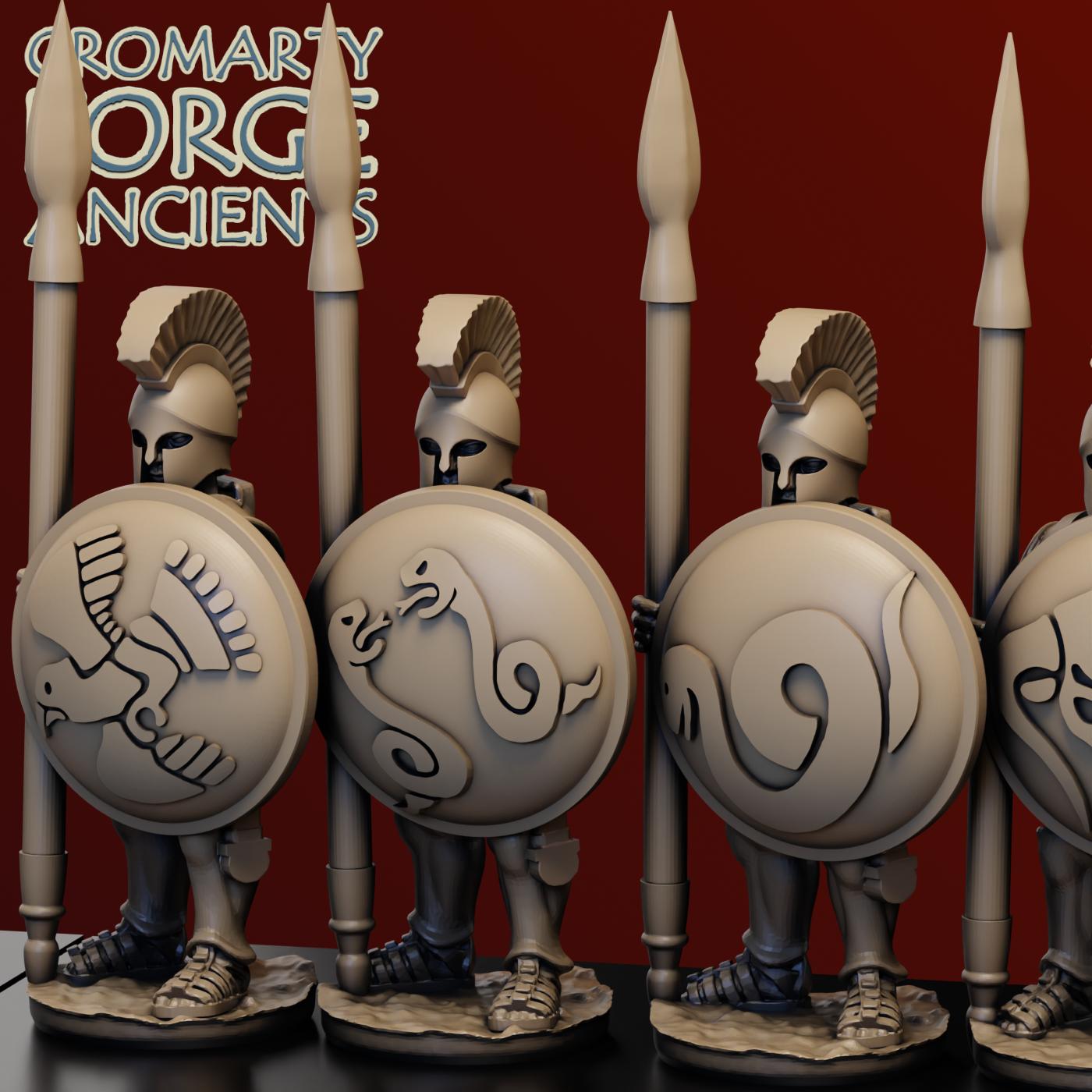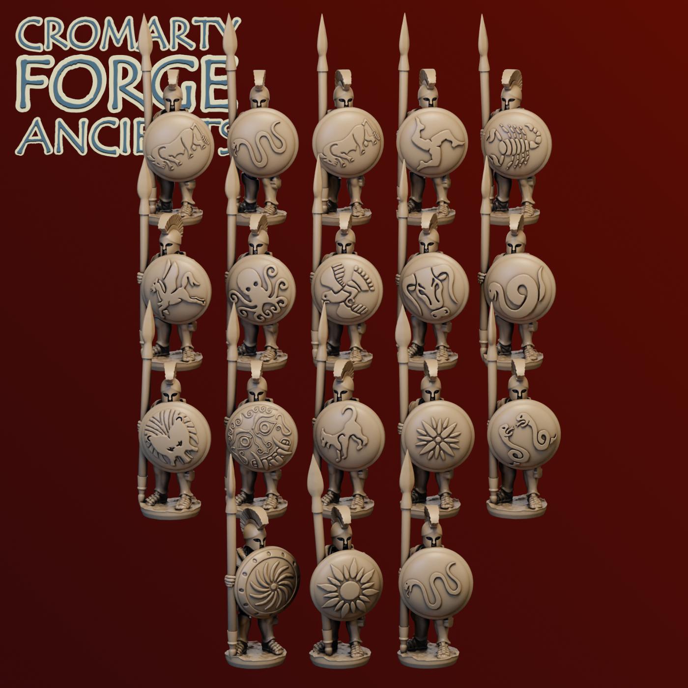 15mm Earlier Greek – Hoplites set contains files to print a huge variety of hoplites (with body armour). Each sculpt is presented with 2 or more helmet options (including the iconic Corinthian and Illyrian) and both with and without cloaks. The 15mm sculpts are presented with separate Hoplon shields.