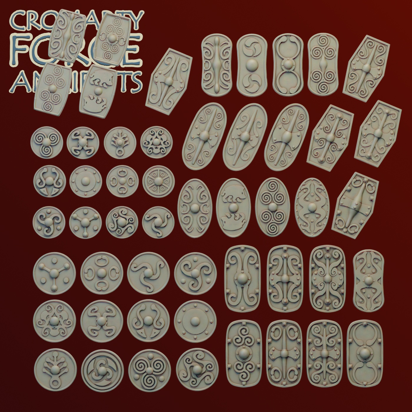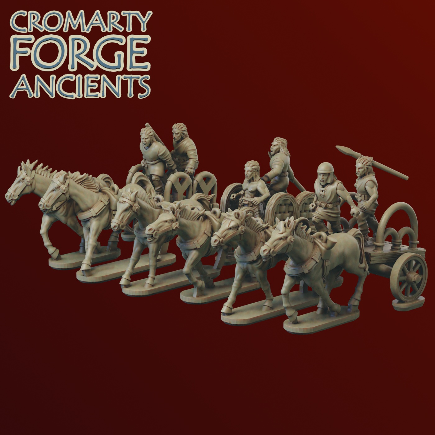 The Gallic Chariot set consists of stl files for 3 chariot crew, 3 chariot drivers, 6 horses and 8 chariots, as well as over 50 shield designs.