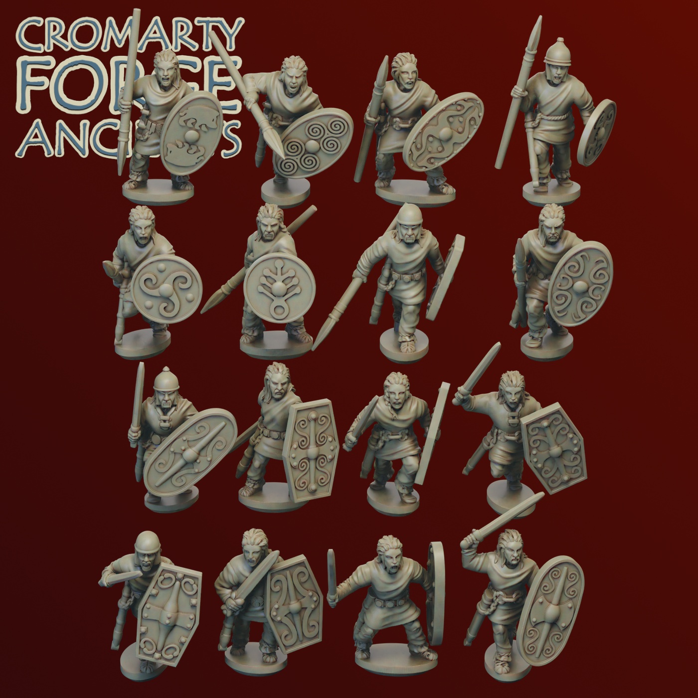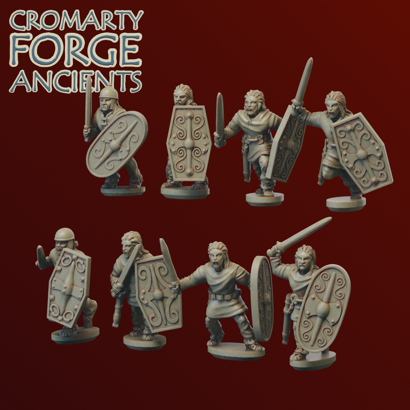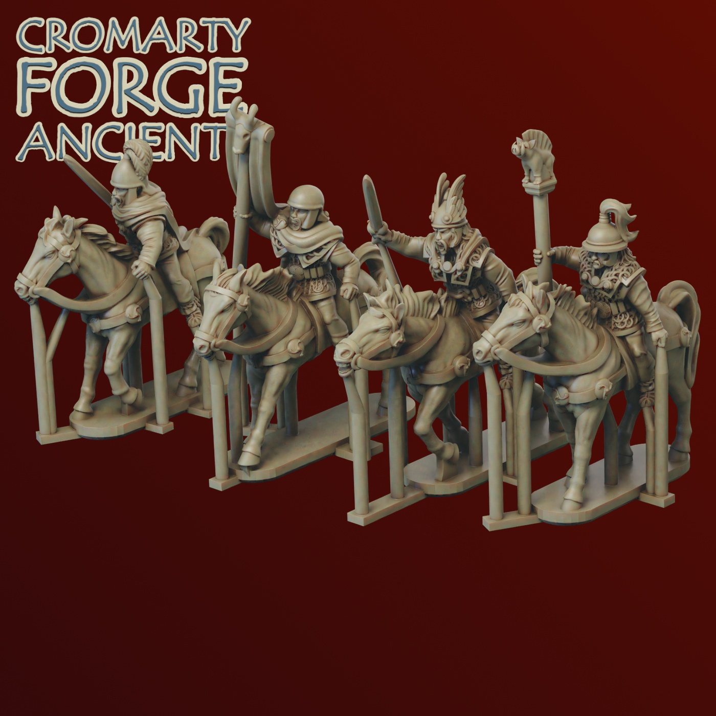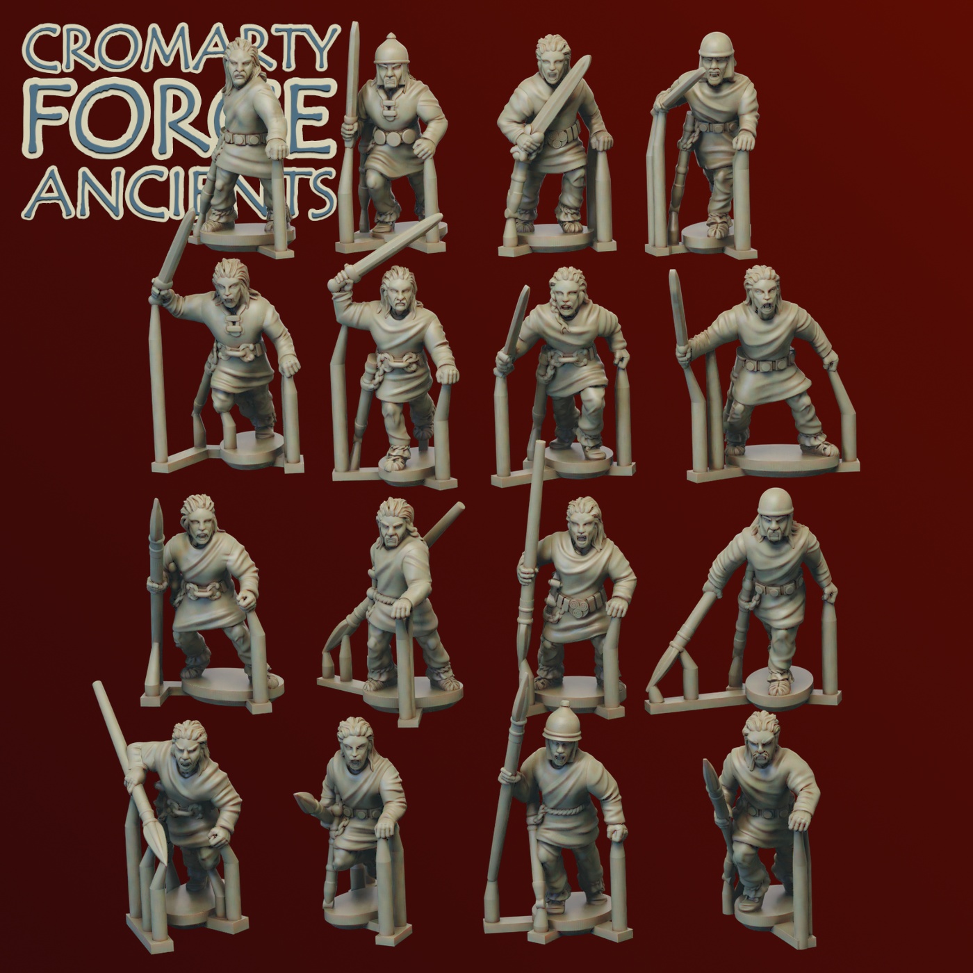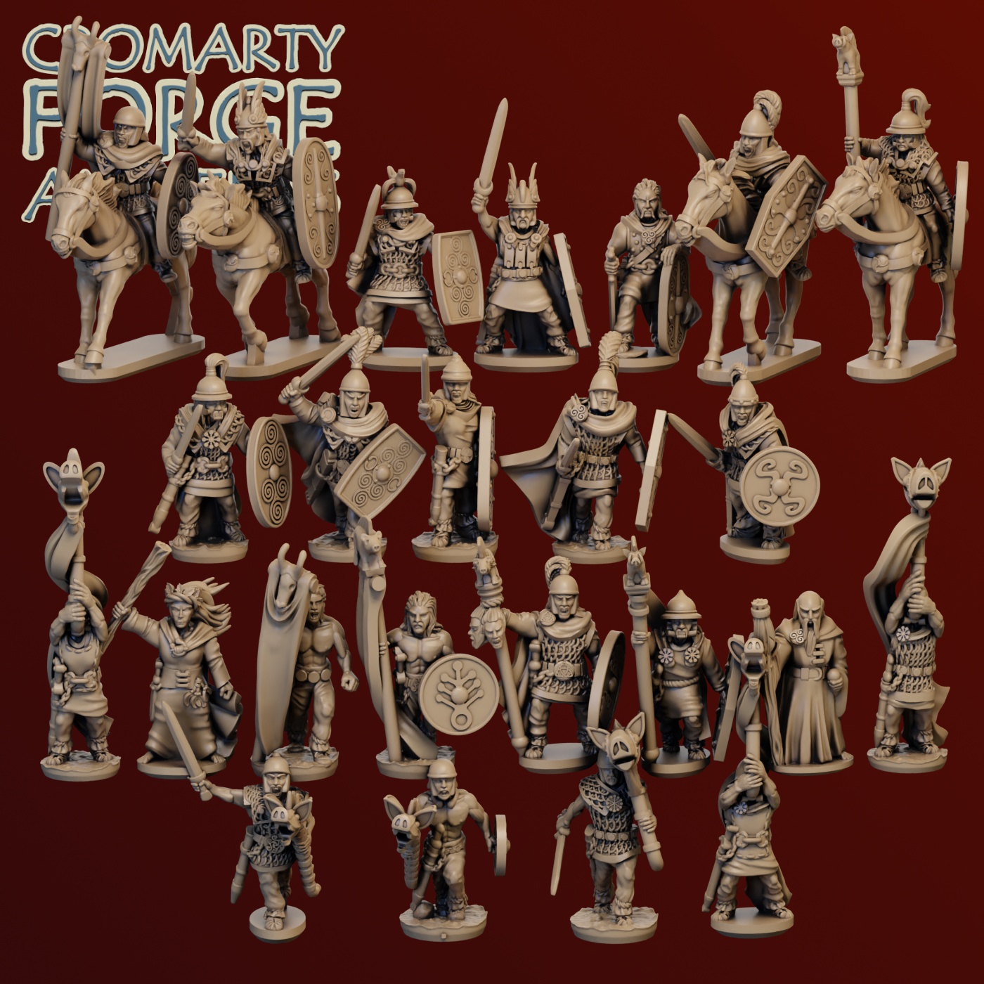 The Gallic command set consists of stl files for 20 Gauls on foot (2 druids, 7 commanders, Vercingetorix, 4 banner bearers and 6 Carnyx) and 4 mounted Gauls (2 commanders, and 2 banner bearers).