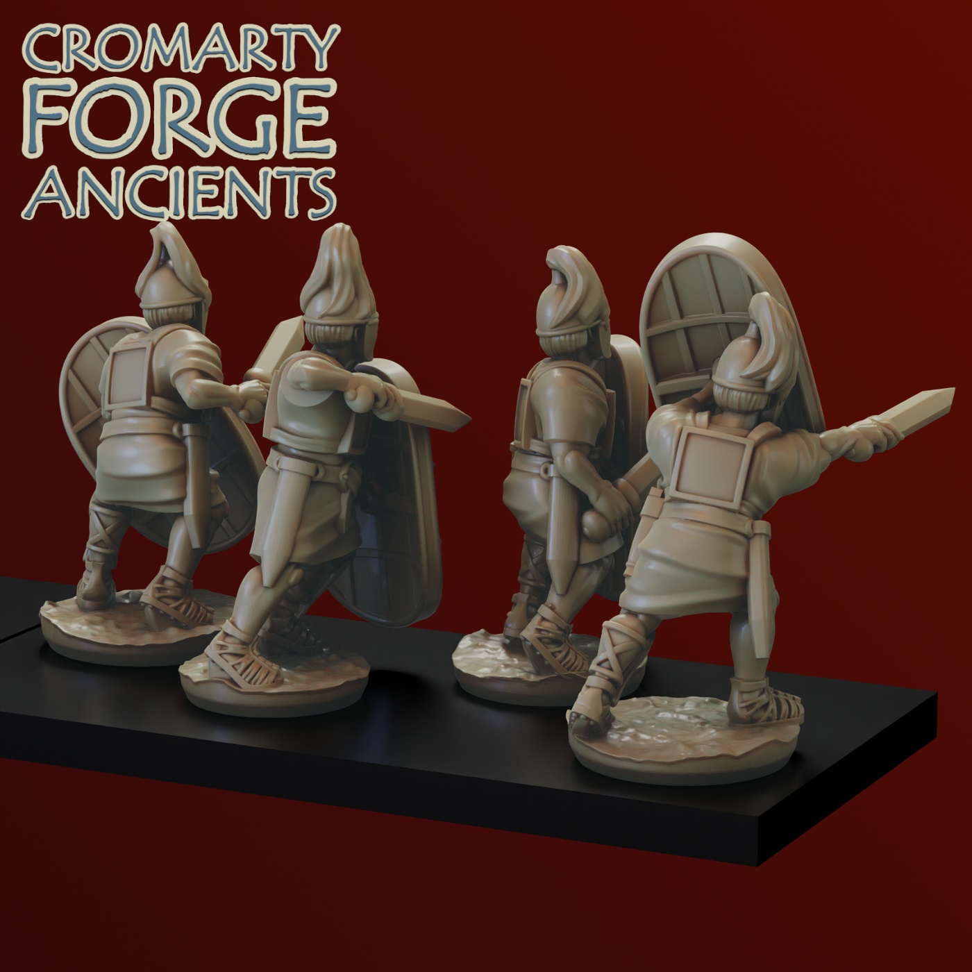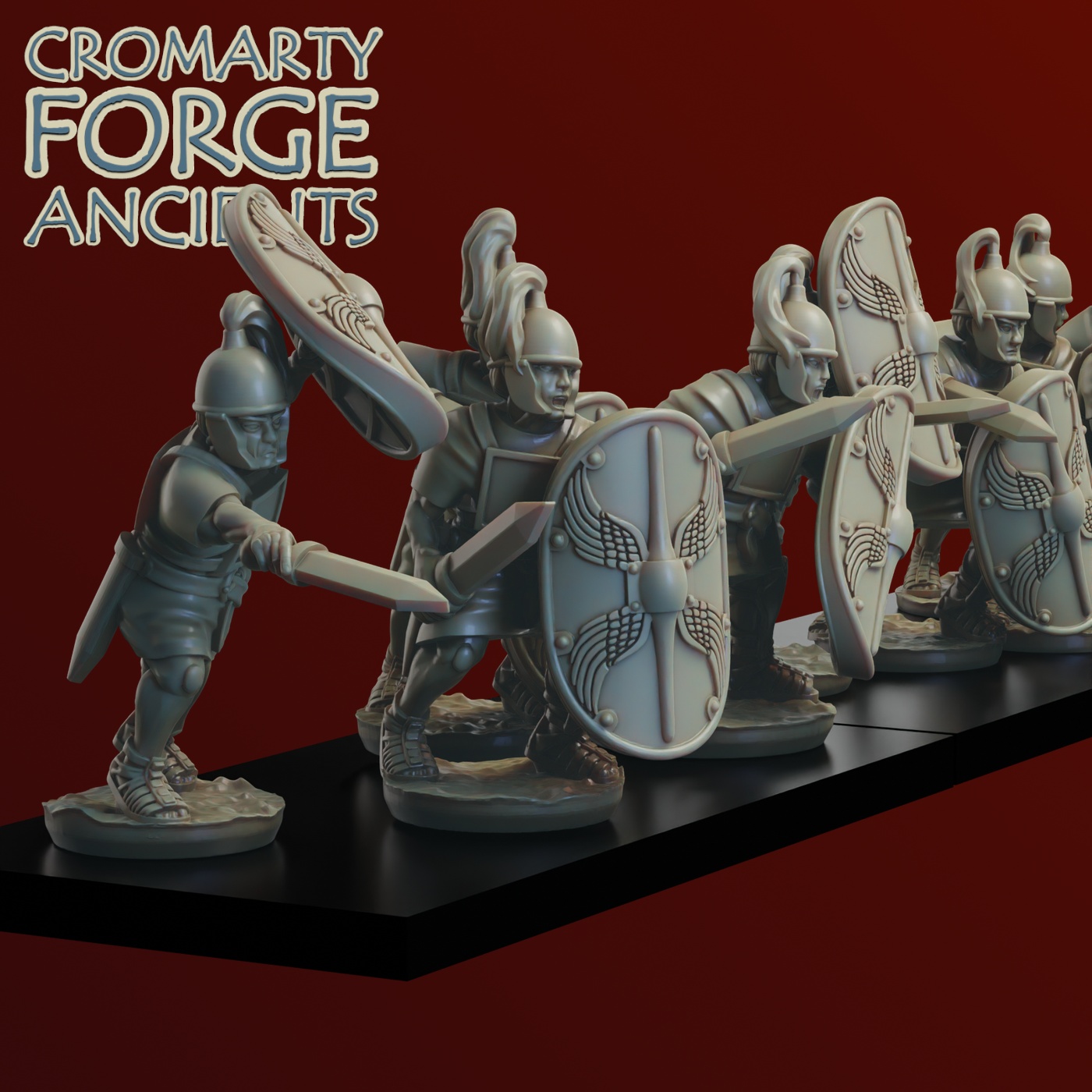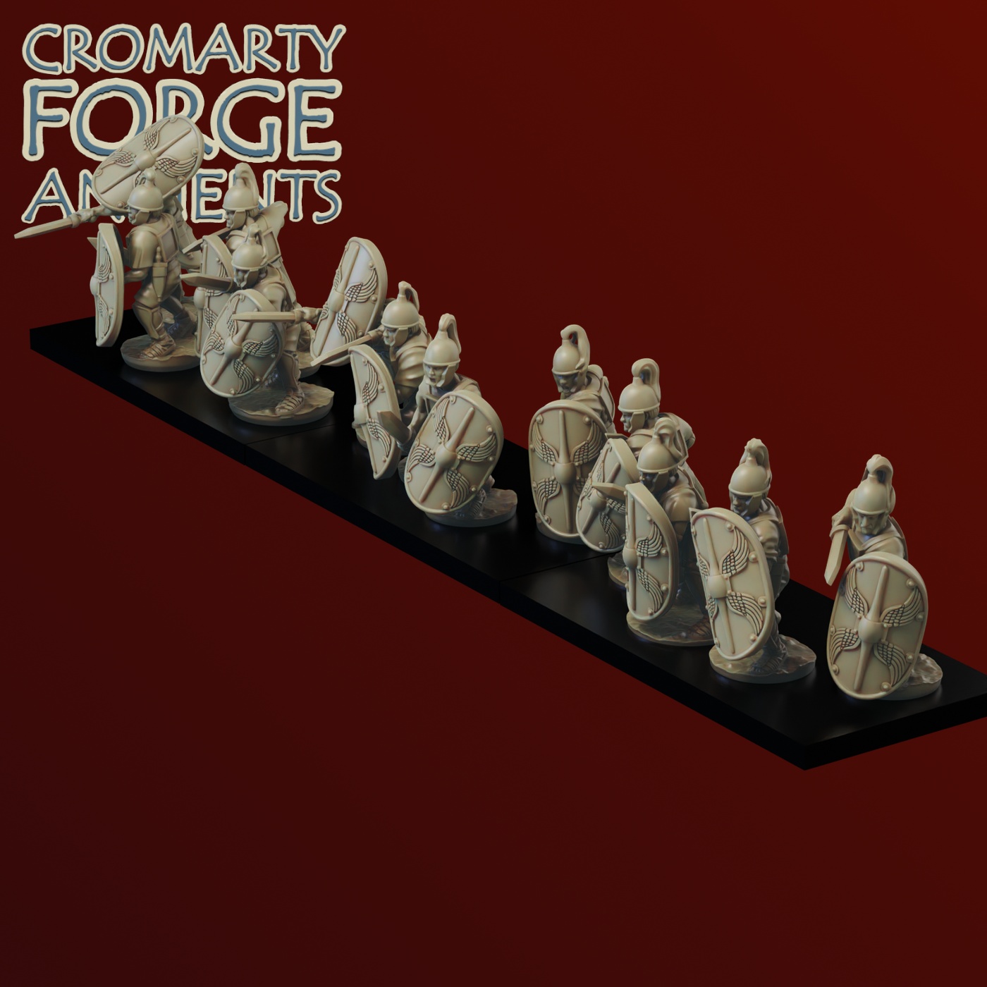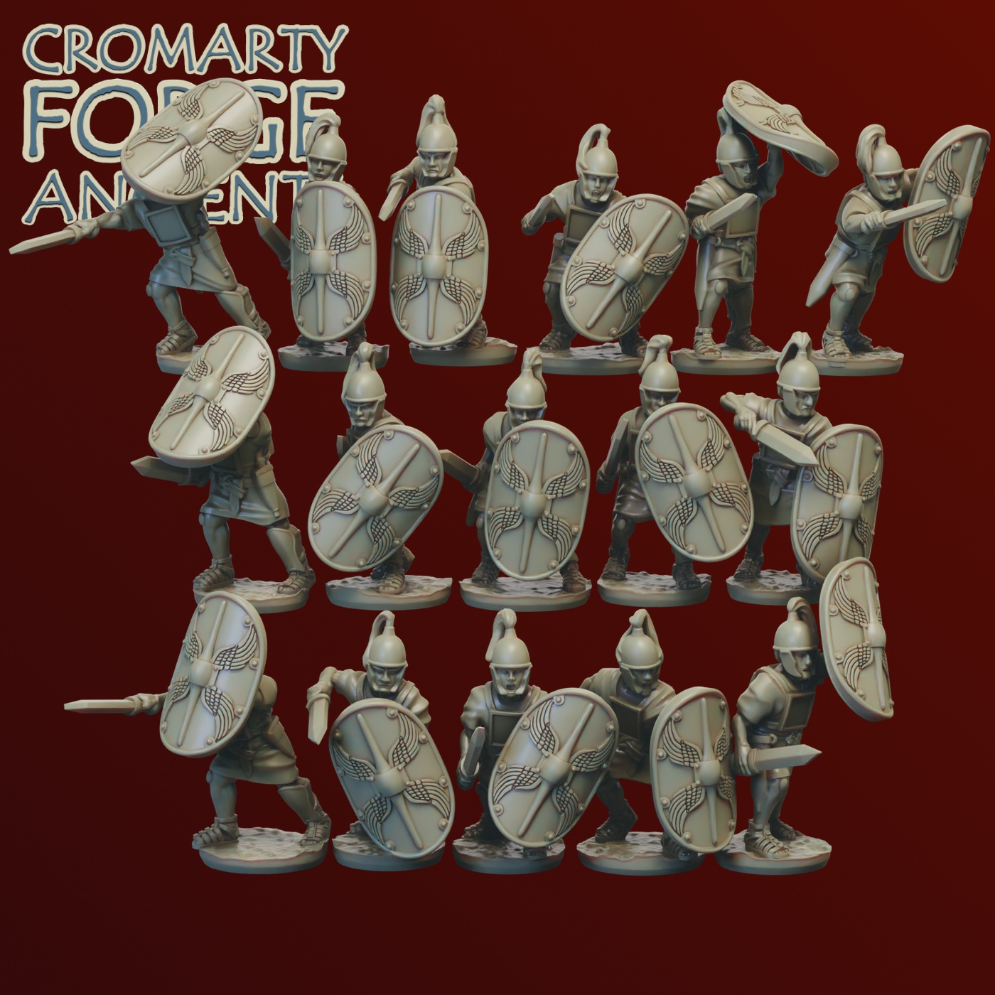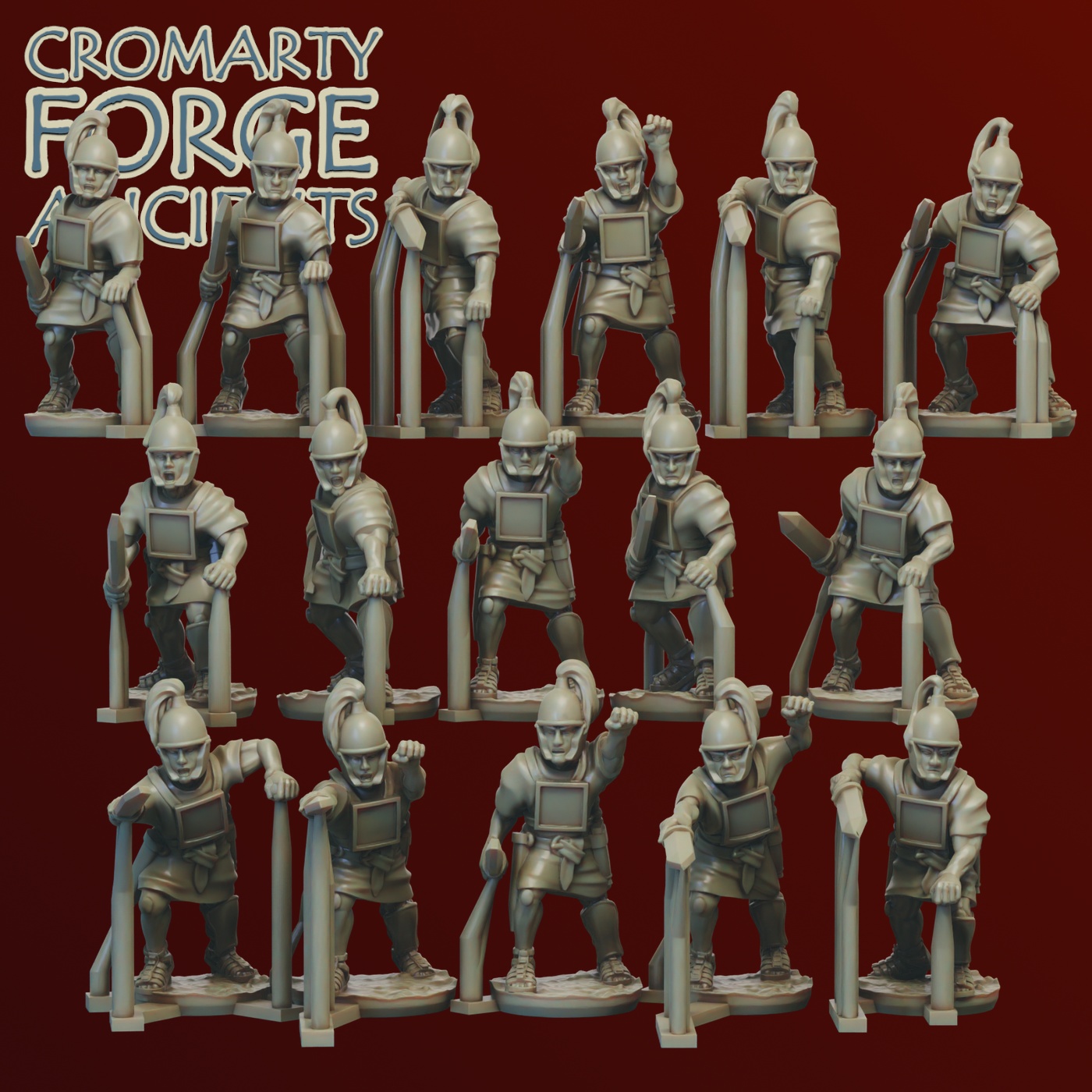 The mid republic Romans Hastati Attack set consists of 16 Hastati attacking with Gladius. Supplied with files for 12 different scutum: 5 designs and a blank, with and without imbedded Pilum.