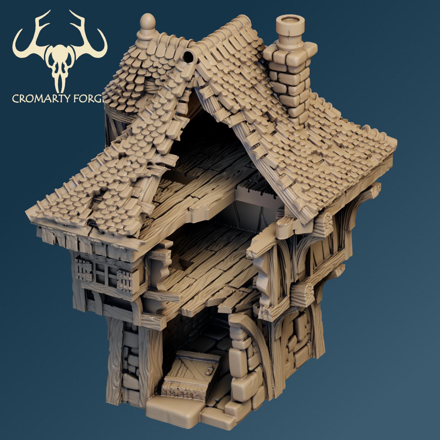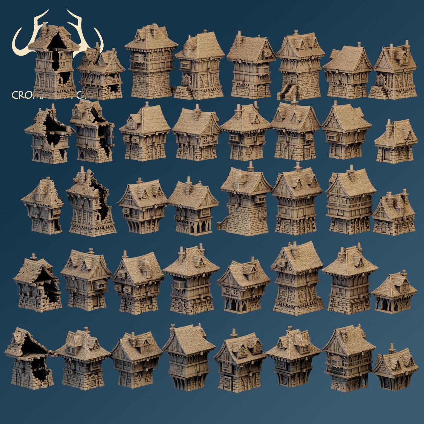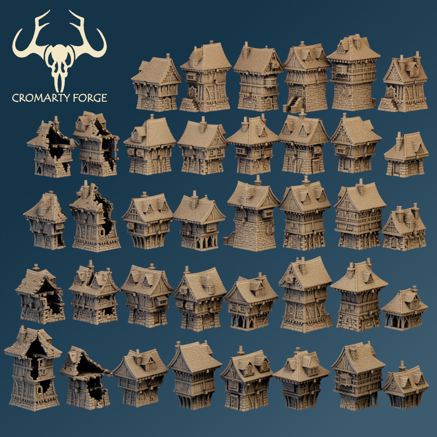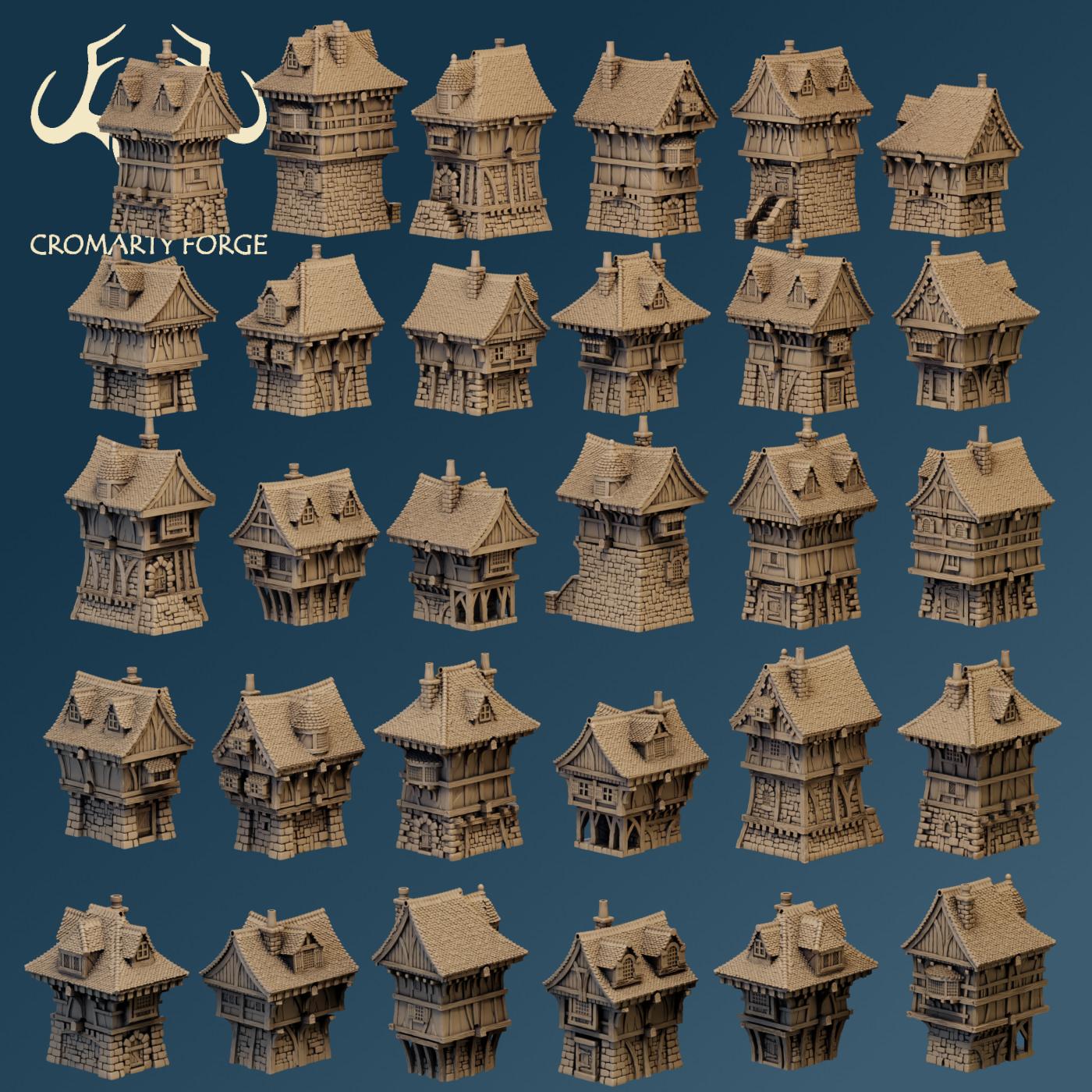 These buildings are designed to be largely interchangeable with one another, so most bases are compatible with most mid sections and most mid sections comparable with most roofs. They even include 5 roofs designed to fit directly onto base sections to make smaller houses. When combined with mirroring, and stood amongst the previously released town-houses, Church, towers and city walls, it should be possible to create full city-scapes.